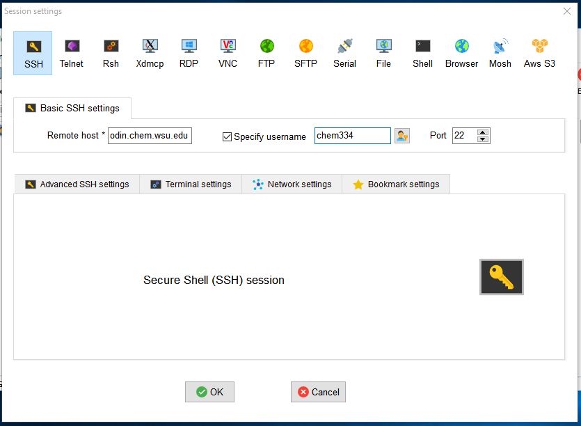 Screenshot of MobaXterm Session Settings. The following values are entered: Remote Host: odin.chem.wsu.edu; Specify Username: Ticked Box; Specify Username: chem334; Port: 22. (Image links to larger version.)
